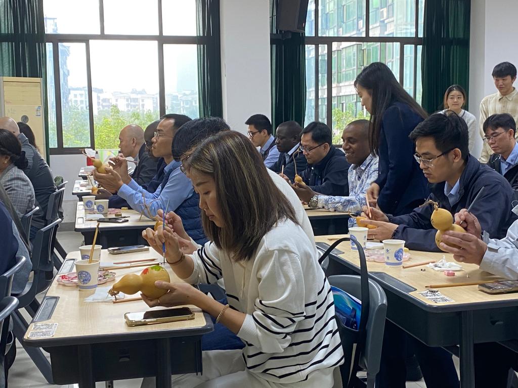 11月14日,作为南岸区人文社科基地——重庆数字非遗科创基地,迎来了市长奖学金丝路项目高级研修班的留学生们。在基地师生带领下,研修学员于上午9:30抵达基地共建单位——南岸区花园路街道南湖社区,开启了一段独特的文化探索之旅。他们不仅参观了三益社区,还亲身体验了非物质文化遗产南岸葫芦画的独特魅力。在非遗传承人李华渝老师的指导下,他们学习了葫芦画的制作技巧,从挑选葫芦到上色,每一步都充满了新奇和挑战。