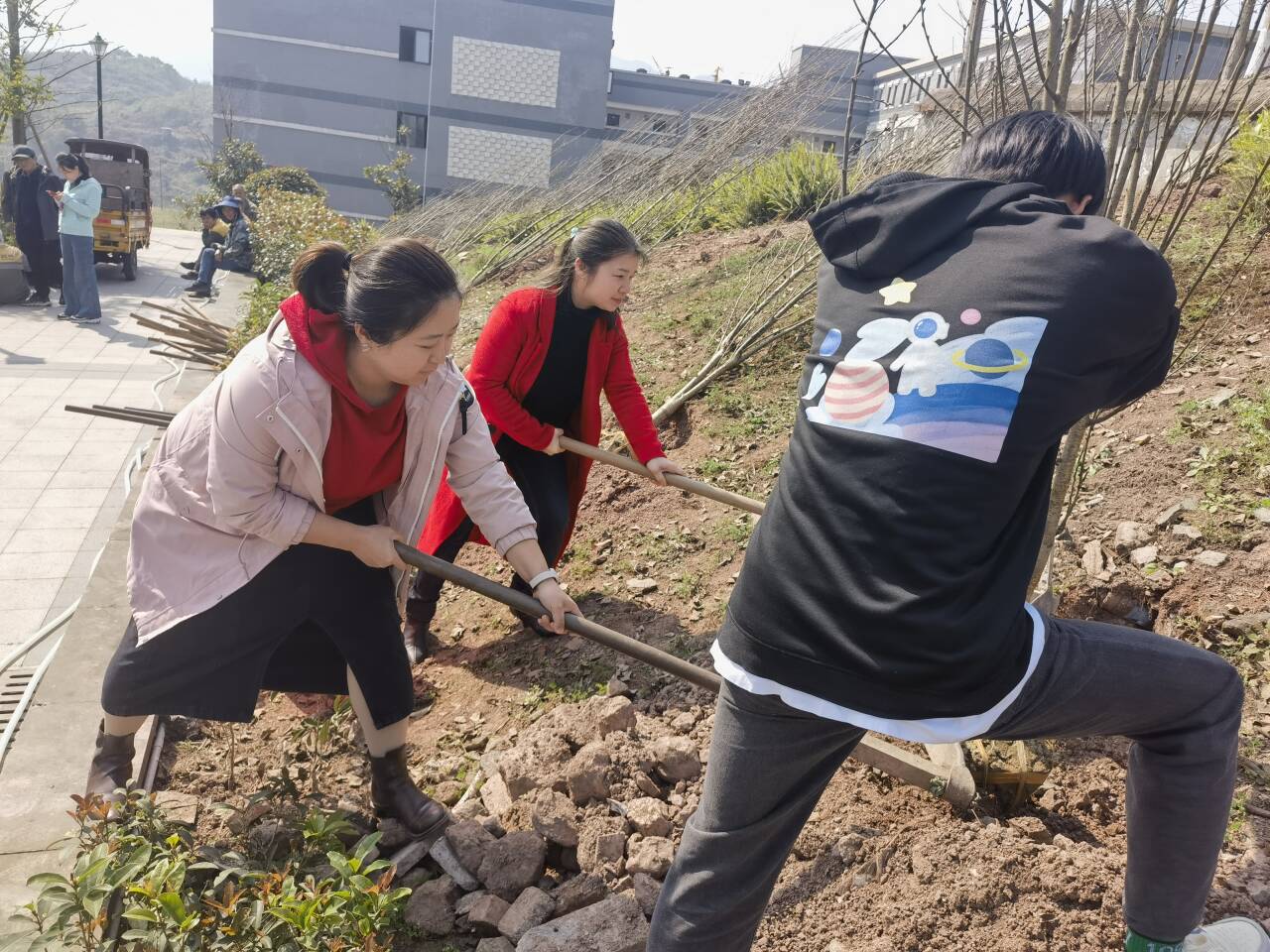 学院党总支下属两个党支部教师党员、学生入党积极分子代表在学校园林实训基地参加义务植树活动。植树现场,大家三五成群,相互协作,挥镐扬锹、挖坑翻土、扶正树苗、培土压实、浇水灌溉,大家干劲十足,热火朝天,为校园新添了一抹亮丽的新绿。
