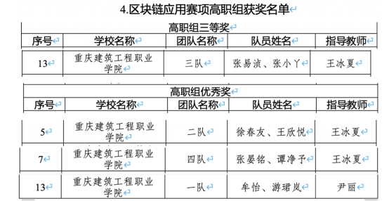 2023年11月26日,由重庆市教育委员会主办,重庆城市科技大学承办的2023年重庆市大学生区块链技术应用创新大赛顺利完赛,全市36所本专科学校、共171支参赛队伍分别参与了区块链技术赛项和区块链应用赛项的角逐。在区块链应用赛项中,koko体育经济管理与公共事务学院王冰夏、尹丽老师指导的金融服务与管理专业2023级学生张易浈、张小丫获得高职组三等奖,金融服务与管理专业2023级学生徐春友、王欣悦、张晏铭、谭净予、牟怡和游珺岚获得高职组优秀奖。