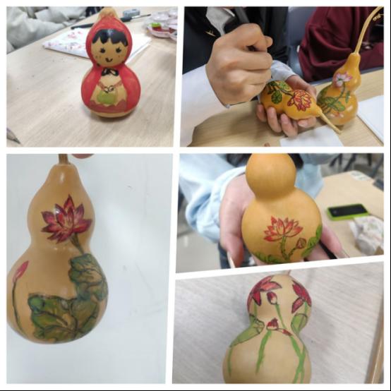 同学们还参观了李华渝老师的工作室,被李老师的作品惊艳了。一个个不起眼的葫芦上绘上了如牡丹、荷花、山水、寿星、仙女、飞龙等各种图案与文字,栩栩如生、惟妙惟肖,作品中倾注了对生活的观察与热爱,同学们爱不释手。