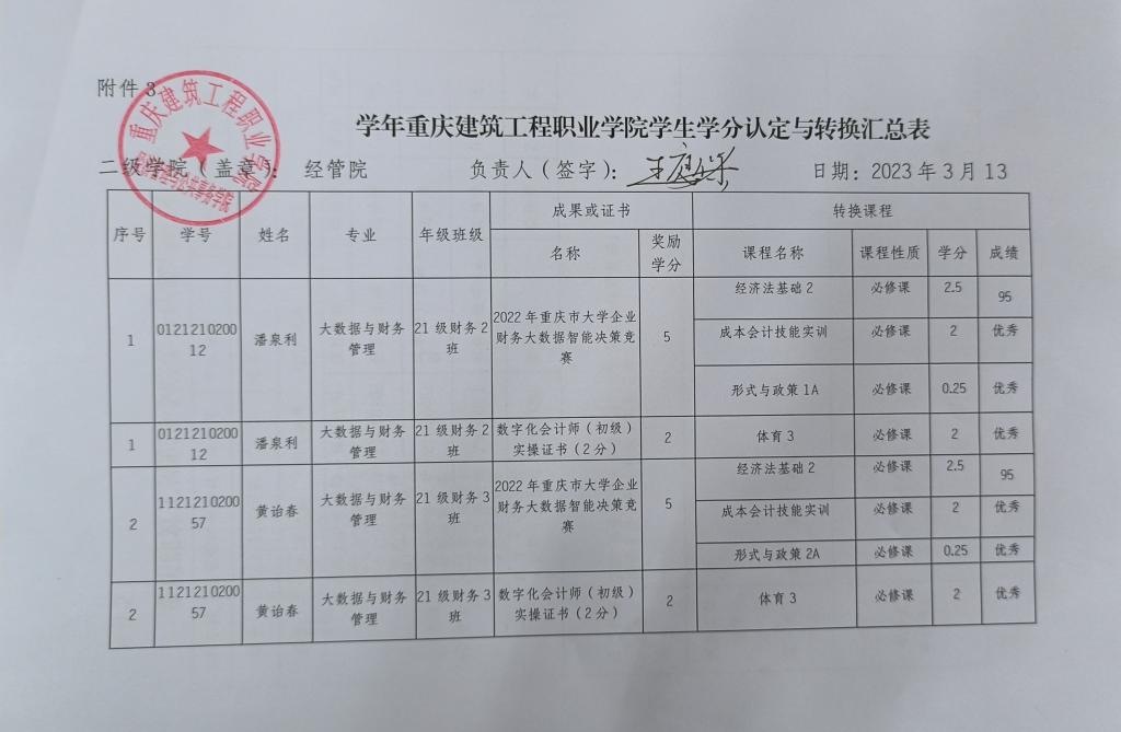 根据学校《关于开展2022-2023学年第1期学分奖励与课程转换认定工作的通知》(建工职院教〔2022〕110号)精神,现将我院学生学分奖励与课程转换认定汇总表予以公示。如有异议,可向学院办公室反映。