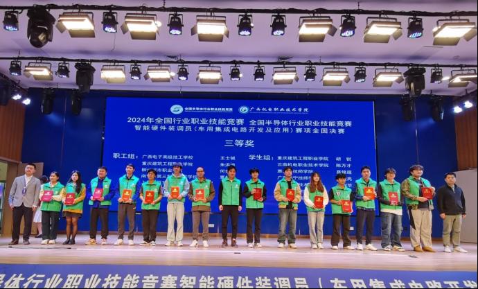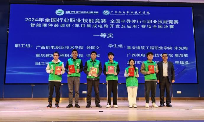 11月24日至27日,2024年全国半导体行业职业技能竞赛智能硬件装调员(车用集成电路开发及应用)全国决赛在广西南宁市广西机电职业技术学院举办。经过理论考核、实操考核环节的激烈角逐,koko体育智能制造学院专业教师徐定成荣获职工组全国一等奖、朱洪浪荣获职工组全国三等奖,学生朱先陶荣获学生组全国一等奖,胡锐荣获学生组全国三等奖,为koko体育争得荣誉。