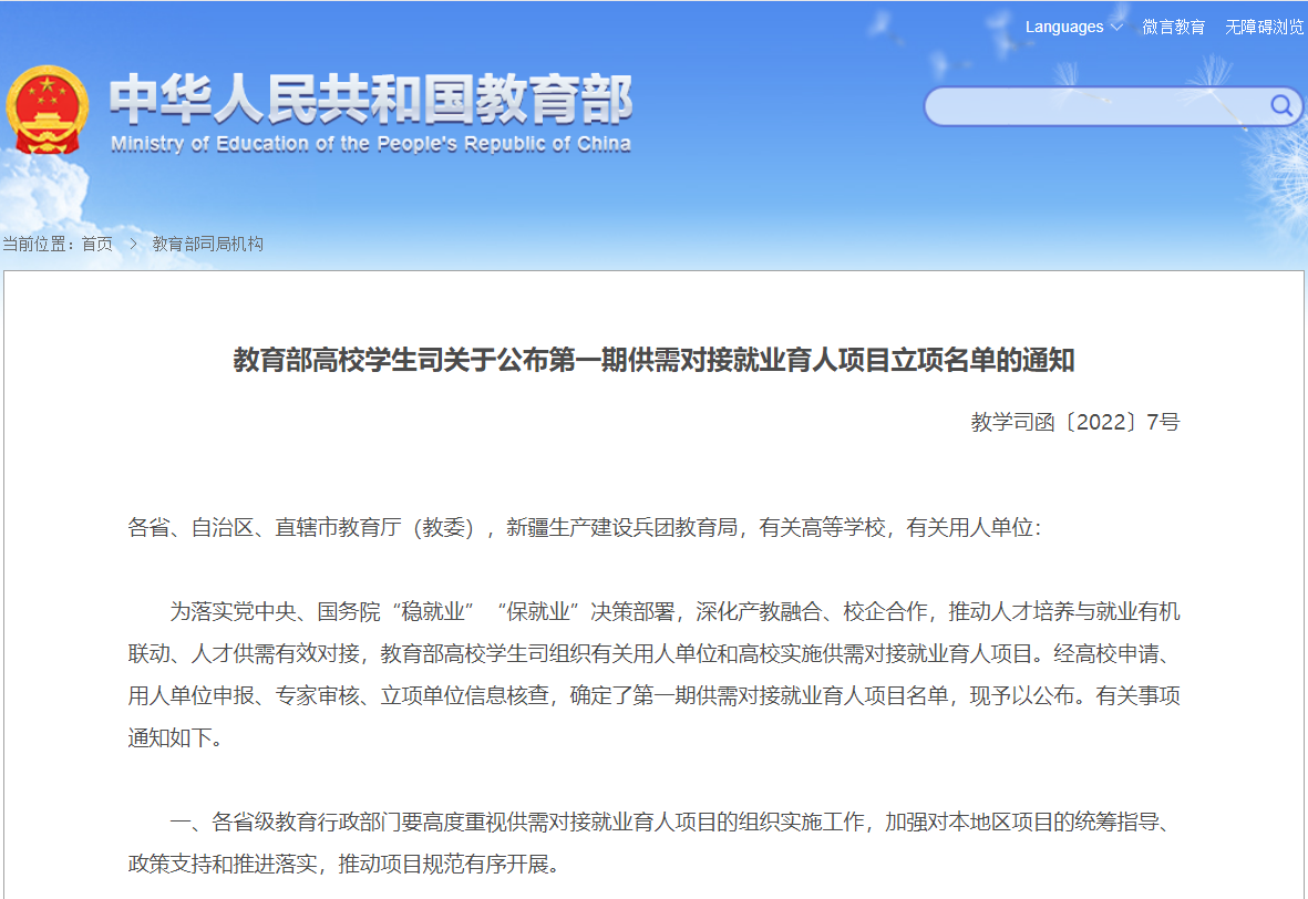 (教育部公布第一期供需对接就业育人项目立项名单)