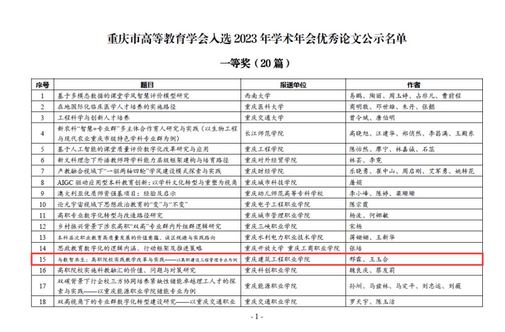 近日,重庆市高等教育学会公示了2023年“现代化新重庆建设与高校学科专业结构调整”学术年会优秀论文入选名单。经专家组评审,koko体育官网建设管理学院邢霖、王玉合2位老师共同撰写的教改论文《与数智共生:高职院校实践教学改革与实践》入选学会2023年学术年会优秀论文一等奖。