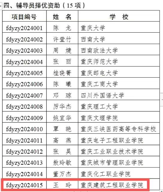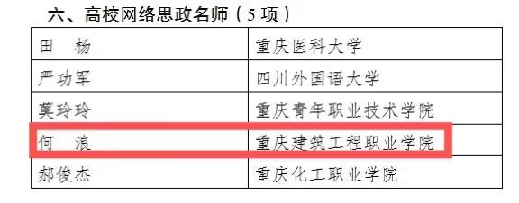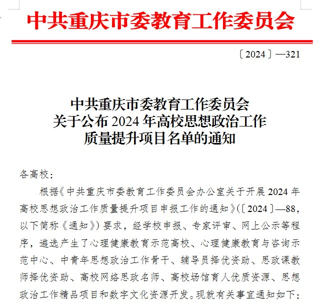 为深入贯彻落实习近平新时代中国特色社会主义思想和党的二十大精神,加快构建高质量思想政治工作体系,深入实施“时代新人铸魂工程”,努力培养堪当民族复兴重任的时代新人,重庆市教育委员会开展2024年高校思想政治工作质量提升项目申报工作。学院党总支副书记何浪入选高校网络思政名师项目,学工部副主任王玲入选辅导员择优资助项目。