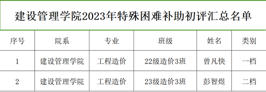根据《koko体育官网关于做好2023年秋季学期特殊困难认定与补助申报工作的通知》相关要求,经学生申请、民主评议小组评议和二级学院认定(评审)工作小组审议,初步评定2名同学获得2023年特殊困难认定与补助资助。其中一档的有一名,二档的有一名。