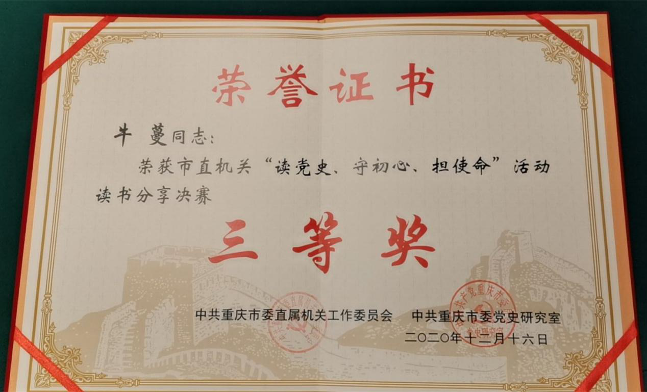 12月16日,市直机关“读党史、守初心、担使命”活动读书分享决赛举行。由市直机关8个党建工作协作组近百名推荐选手中选拔15名围绕“读党史、守初心、担使命”主题开展了读书分享决赛。我院牛蔓老师从《初心 使命 奋斗——巴渝革命烈士诗文选录》书中凝结的共产主义理想信念的精神之花、革命者至情至爱的人性之美读到了初心,读懂了使命,读出了奋斗,以一个个大义凛然、高风亮节的人物故事和自己的工作感悟感动了在场的评委和观众,荣获三等奖。