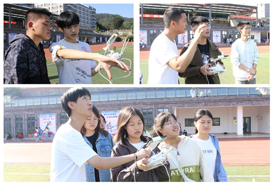 随后,活动小组在学院体育场进行了无人机的飞行表演。表演项目由火箭垂直起降、纸飞机双机表演、F35战斗机及翼龙300发射导弹、翼龙拉烟和SU27战斗机双机空中特技表演等部分组成。这些项目全方位展示了各类无人机的性能特点和操作技巧,同时又具有极强的观赏性,吸引了大批师生驻足观看,随着无人机在天空中翻转翱翔,现场观众的热情掌声也阵阵响起。活动的最后,建管系党总支书记黄霁在现场同学中抽取了几名幸运观众参与无人机操作,活动小组成员手把手地教学,从起飞到上升、前进、后退、左转、右转以及落地等基础操作,这几名幸运观众体验着无人机在空中尽情畅飞的快乐。