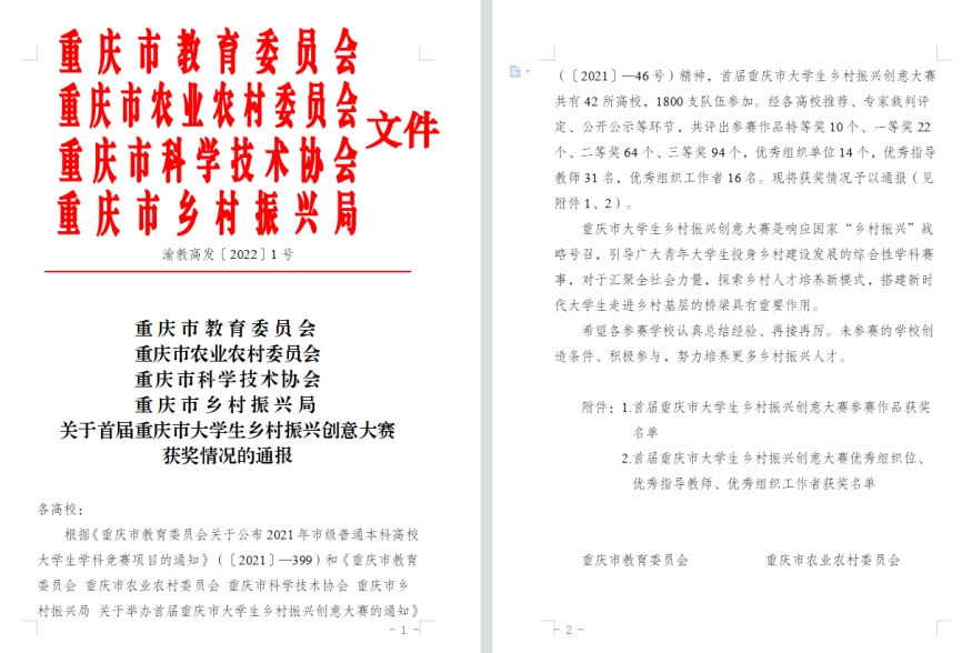 近日,由市教委、市农业农村委员会、市科协、市乡村振兴局主办,以“创意点亮乡村,创新助力振兴”为主题,永川区黄瓜山村为赛点的重庆市大学生乡村振兴创意大赛最终获奖名单新鲜出炉。