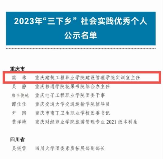 近日,由中央宣传部、中央文明办、教育部、共青团中央、全国学联联合开展的2023年全国大中专学生志愿者暑期文化科技卫生“三下乡”社会实践活动对表现突出的优秀集体、个人和项目进行了总结表彰。我院樊林老师荣获全国“三下乡”社会实践优秀个人。
