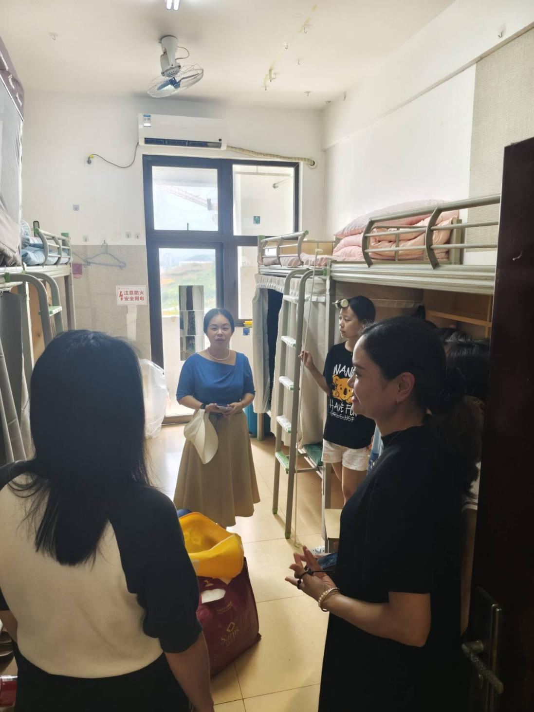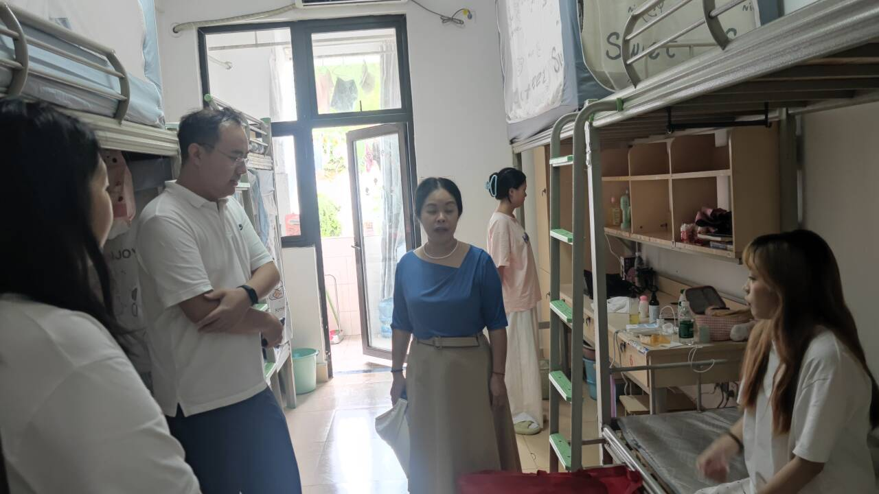 何浪书记一行先后走访了4栋、5栋等多栋新生宿舍楼,逐一检查寝室设施安全、用电规范、卫生环境等情况。“插座是否完好?”“阳台护栏是否稳固?”“有没有发现漏水问题?”何书记细致询问同学们在住宿中是否遇到困难,并叮嘱大家严格遵守宿舍管理规定,杜绝使用违章电器,共同维护宿舍安全。随行辅导员认真记录同学们反馈的问题,并联系后勤部门及时跟进维修。