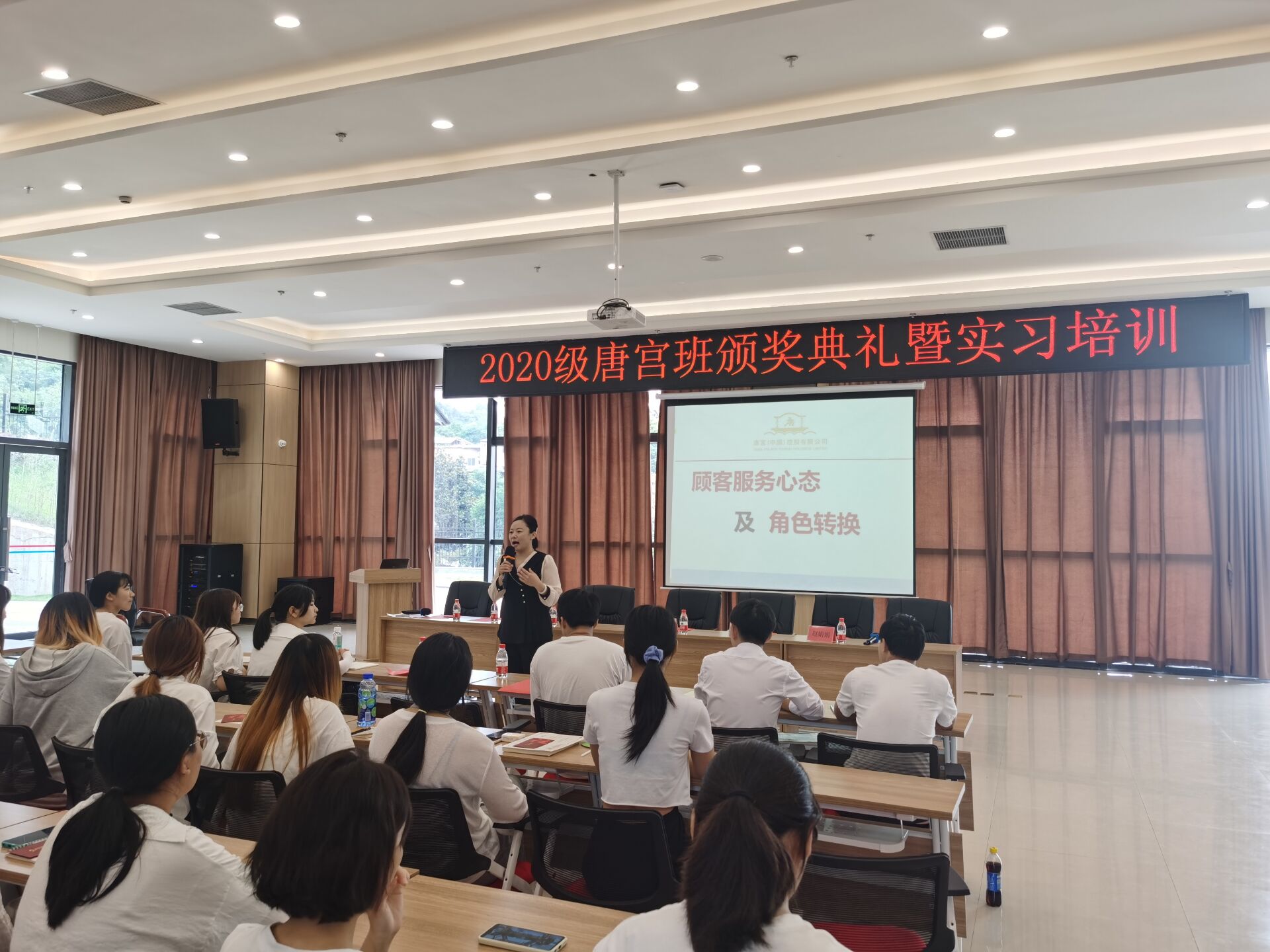 颁奖典礼后,香港唐宫集团培训主管赵娟娟以“顾客服务心态及角色转换”为题,给唐宫班学生做了一堂生动的实训前培训。集团招聘经理曹玲也就后期的实习入离职、考勤、培训、薪酬福利等做了相关说明及答疑。