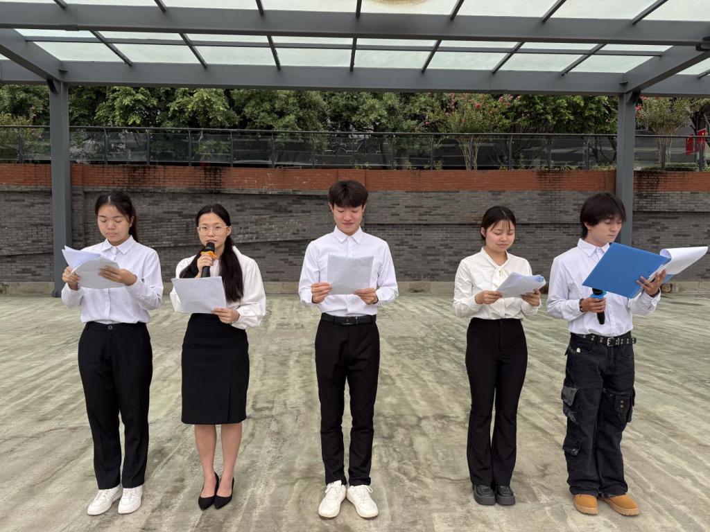 仪式伊始,伴随着雄壮的国歌与校歌,五星红旗与校旗先后冉冉升起,全体师生肃立行注目礼,尽显庄重。随后,24级“助友创美订单班”学生以《此心安处是吾乡——将爱国情怀镌刻在社区治理的第一线》为题发表演讲,结合老旧小区治理实践,生动诠释了青年学子如何以实际行动践行爱国情怀,展现了校企协同育人的成果。