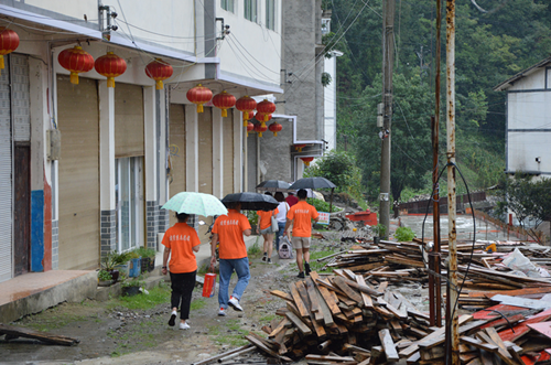 (志愿者们冒雨走访贫困户)
