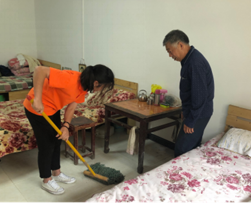 (志愿者为老人打扫房间)