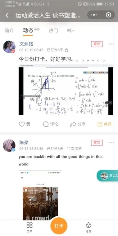 坚持打卡的过程中,其实每天给自己定的目标并不高,但一旦立下这样的Flag,心理上就不会允许自己放水。每天晒出打卡内容以此作证,督促自己行动起来,就会让自己少很多偷懒的机会。