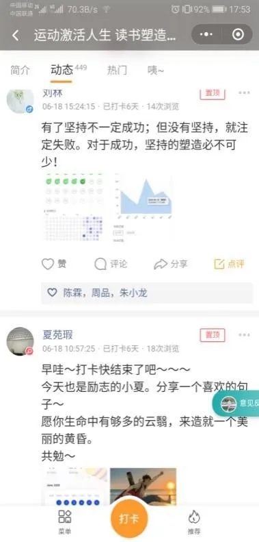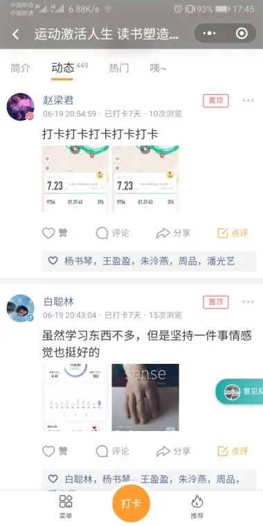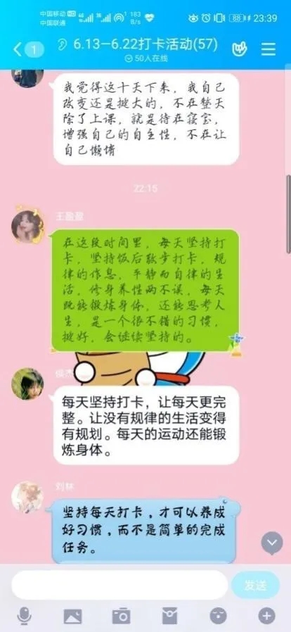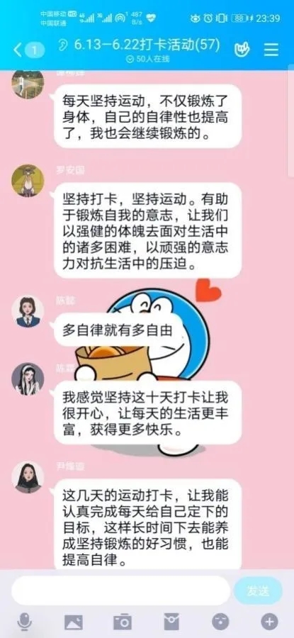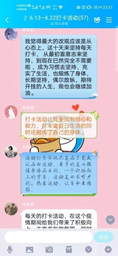 同学们对于此次活动的感想,积极地分享给群里一起学习、运动的小伙伴,既鼓励了其他人,也约束了自己。