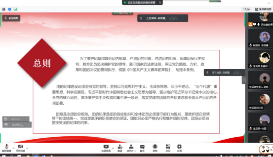 为严格落实疫情防控要求,本次培训采取线上方式举办,会议由主席团成员吴依蔓主持,院学生会全体工作人员参加,培训内容主要包括“习近平新时代中国特色社会主义思想、党的十九届六中全会精神、“我为同学做件事”主题活动分享交流等内容。参会人员纷纷表示获益匪浅,表示将继续努力,提升自身能力,用实际行动唱响时代最强音。