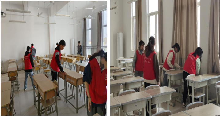 为确保志愿服务活动能够顺利开展,志愿者们提前集合在四号教学楼前,在负责人的讲解下对小组进行了任务分配。志愿者们自觉组织分工把桌椅摆放整齐,对已损坏的桌椅进行了登记并报修学校,对教室的门窗进行了擦拭,从五楼到二楼,整理后的桌椅变得焕然一新,教室也更加整洁了。