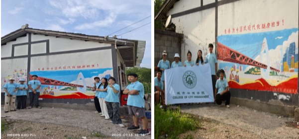 仲夏七月,烈日灼灼。在重庆市彭水苗族土家族自治县联合乡同连村的主干道外墙上,一幅20平方米的彩色墙绘正悄然成型。7月11日至13日,城市治理学院“青春筑梦,薪火乡传”实践团的青年学子们,以汗水为墨、专业为笔,将“中国新建造,建设新重庆”的宏伟愿景描绘在苗乡村落,用艺术实践书写乡村振兴的青春答卷。