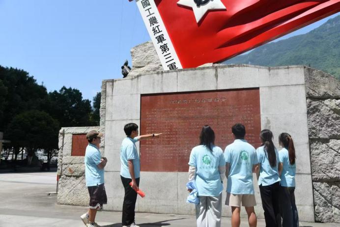 实践团首先来到彭水红军渡,这里曾是红军长征途中的重要站点,承载着革命先辈与当地群众鱼水情深的红色记忆。团队成员在讲解员的带领下,聆听了当年红军路过彭水时,帮助老乡挑水、种地、救治伤员,以及老乡们为红军送粮、当向导的感人故事。一张张老照片、一件件旧物件,让大家深刻体会到革命年代军民互助的深厚情谊。实践团成员还在红军渡纪念碑前重温入团誓词,立志将这份“为民服务”的红色精神融入未来的学习和工作中,以实际行动传承革命先辈的初心使命。