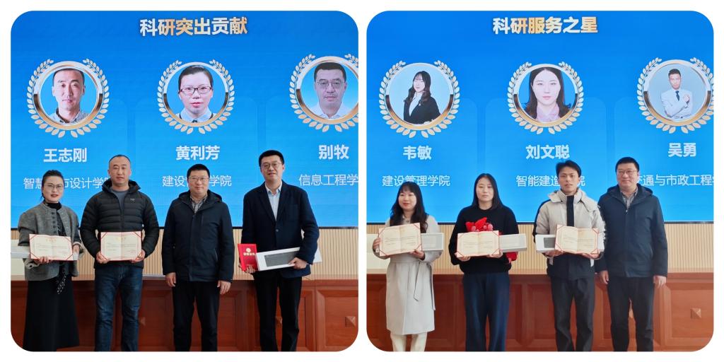 校长郑周练为王志刚、黄利芳、别牧3位教师颁发“科研突出贡献”荣誉证书,为韦敏、刘文聪、吴勇3位科研管理人员颁发“科研服务之星”荣誉证书,表彰其为学校科研事业进步发挥的重要作用。