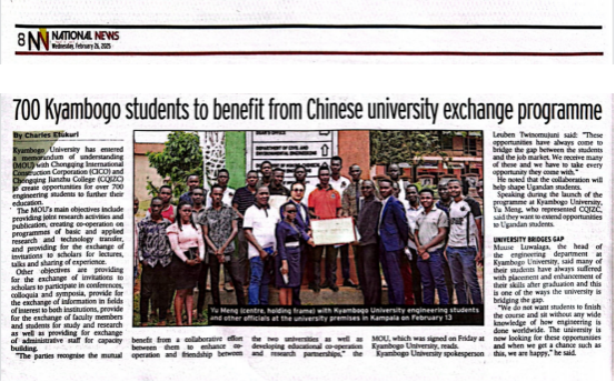 此次合作受到乌干达当地媒体New Vision的报道,报道指出,随着中乌两国高校合作项目的深入开展,中国将帮助乌干达培养更多本土化技术技能人才,提高其就业竞争力,对推动当地经济发展有着积极作用。