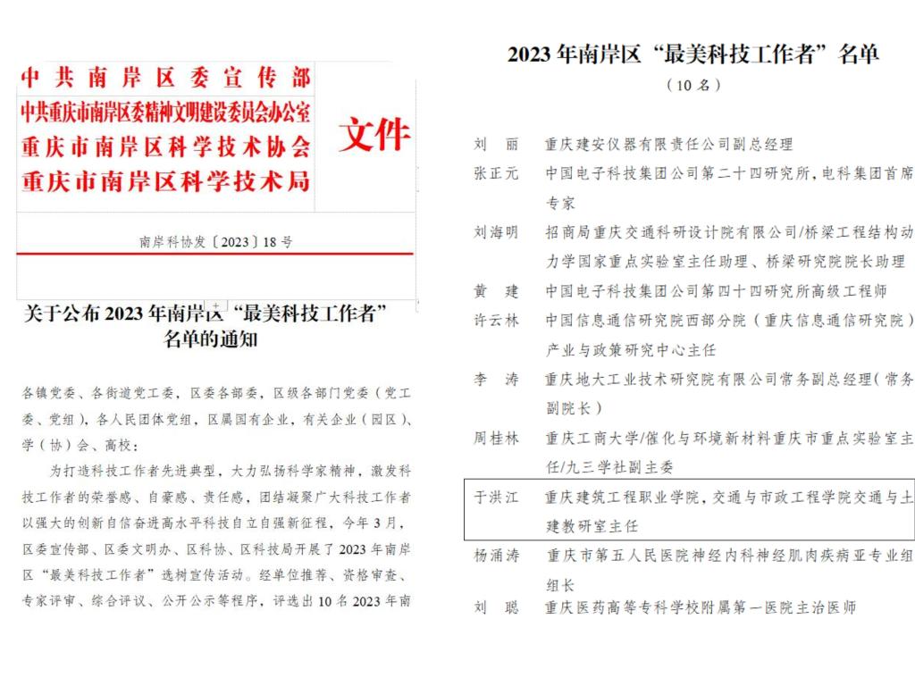 近日,中共南岸区委宣传部、中共重庆市南岸区委精神文明建设委员会办公室、重庆市南岸区科学技术协会、重庆市南岸区科学技术局联合发布了《关于公布2023年南岸区“最美科技工作者”名单的通知》(南岸科协发〔2023〕18号),我校教师于洪江获得“最美科技工作者”称号。