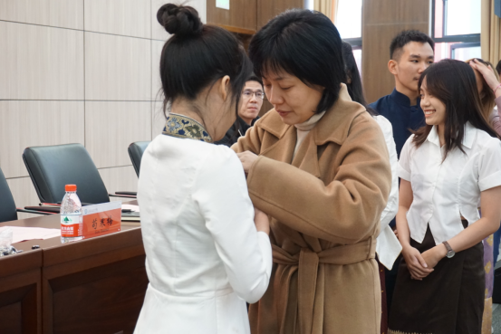 此外,仪式上陈依民副校长还为每位国际同学佩戴了学校校徽,锃亮的校徽上镌刻着耀眼的荣光,也昭示着各位新同学正式成为一名建工职院人。