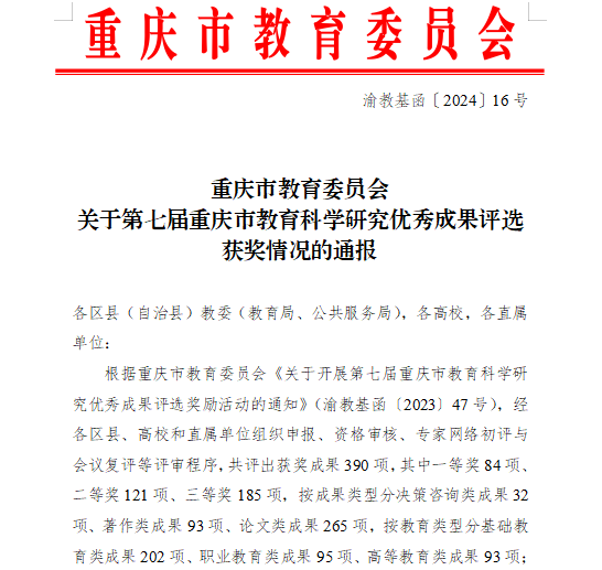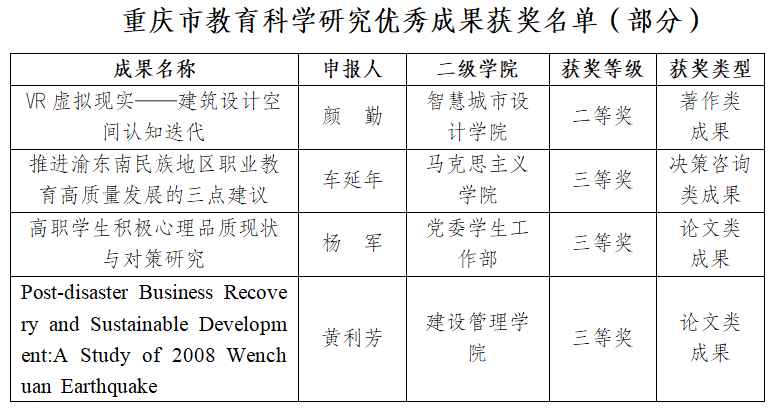 近日,重庆市教育委员会公布了“第七届重庆市教育科学研究优秀成果”获奖名单,koko体育教师颜勤获著作类成果二等奖,车延年获决策咨询类三等奖,杨军、黄利芳获论文类三等奖。此次获奖,是对koko体育教师积极探索的科研精神、稳步提升的科研能力的肯定,也是koko体育坚持实施创新驱动发展战略的硕果。今后,koko体育将继续强化高水平高质量科研成果产出,为“双高”建设添砖加瓦。