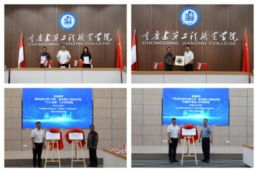 交流会上,三方共同签署教育合作备忘录,并为“中文+建造”人才培养基地、“巴渝数字建造人才培养基地”揭牌,未来三方将在共建人才培养基地、共培国际化师资、共享课程资源等方面开展深度合作。