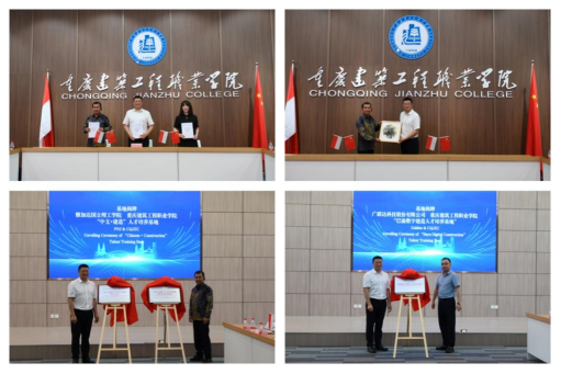 会议期间,郑校长、雅加达国立理工学院校长易卜拉欣先生及广联达科技股份有限公司数字教育事业部国际合作总监安琪女士共同签署教育合作备忘录(MoU)并揭牌“中文+建造”人才培养基地、广联达科技股份有限公司“巴渝数字建造人才培养基地”。
