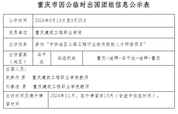 按照市委、市政府关于因公出国实行信息公开、建立出国团组信息公示制度等相关要求,根据已报市外事工作领导小组批准的2024年度教学科研人员因公临时出国开展学术交流合作团组出访计划,现将拟组团赴乌干达参加“中非地区公路工程行业技术技能人才研修项目”的相关信息予以公示(详见因公临时出国信息公示表)。