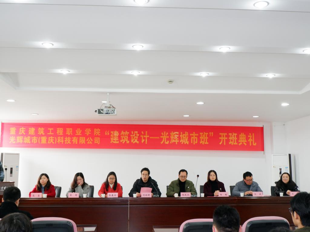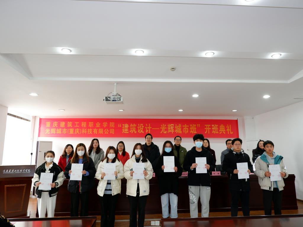 光辉城市教育事业部总经理杨庆江、产品负责人王涵、副校长刘幼昕、招生就业处处长杨超、教务处处长张春丽、实训中心主任杨旗、智慧城市设计学院党总支书记彭珂、智慧城市设计学院院长高露、相关专业老师以及2021届 “建筑设计—光辉城市班”全体同学参加了开班仪式。