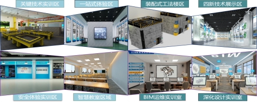 学校建设覆盖装配式建筑全产业链的生产性实训场所,主要包括一站式体验区、关键技术实训区、四新技术展示区、BIM运维实训室、虚拟仿真实训室等。联合行业企业,采用VR、AR、物联网等新技术,开发覆盖全产业链的教学资源,建设教学资源云、教学资源共享平台、课堂质量监测、教学考评等8个系统的智慧教学平台;辅助工位教学一体机及手机端App,同时实现无人化教学,学生通过系统平台在线学习并实操演练,后台实时记录学习过程并进行学情分析及职业能力精准画像,实现智能+“教学做”。运用物联网、大数据等技术,将楼宇与教学设施设备接入云平台,建立实践教学管理、BIM综合管理、数据采集分析、移动智能中控等7个系统的智能管理平台,实现“智能+”管理。