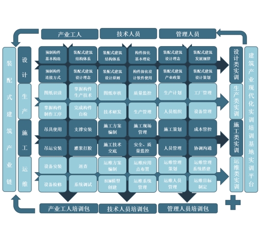 对接装配式建筑“设计—生产—施工—运维”全产业链,学校将产业链急需的主要从业人员分析归类为产业工人、技术人员、管理人员;分别梳理出三类从业人员必备的装配式建筑深化设计、构件生产、现场管理等40余种职业技能,构建贯通全产业链职业技能体系。学校根据职业技能体系开发培训包,全方位培养装配式建筑从业人员,解决装配式建筑各类人才紧缺问题。