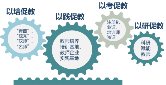 以培促教,分类实施“青苗”“毓秀”“双师”“名师”工程,培养教师在装配式建筑技术方面的专业能力、实践创新能力、教学研究能力和社会服务能力。以践促教,鼓励校企人员双向交流,加大引聘行业导师力度,通过教师企业顶岗,深入了解行业发展前沿,下企业、下车间、下班组,提高教师教育教学能力和专业实践能力。以考促教,鼓励教师考取国家注册执业资格证、装配式建筑类高级考评员证、“1+X”职业技能等级培训师资证书等,夯实教师装配式建筑的从业水平和职业能力。以研促教,坚持科研赋能的教师发展理念,依托国家—省—校三级科研平台,打造装配式建筑“BIM、设计、施工、检测、经济”5个研究团队,紧跟行业发展,不断提升教师科技创新和社会服务能力。