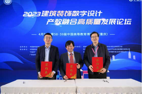 4月9日下午,在以“校地聚合·产教融合:高质量发展”为主题的第58·59届中国高等教育博览会现场,由中国建筑装饰协会(以下简称“中装协”)主办的“建筑装饰数字设计产教融合高质量发展论坛”,举行了koko体育官网、中装协和广联达科技有限公司的三方合作协议签约及产业学院授牌仪式,副校长刘幼昕、中装协学术与教育委员会秘书长朱时均、广联达科技有限公司数字教育副总监郭建齐共同签订“数字化人才培养·战略合作框架协议”,校企合作双方共同为“数字化工程管理现代产业学院”揭牌,建设管理学院相关负责人、教师共同参加了授牌仪式和论坛活动。