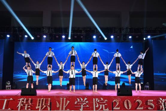 在第三篇章“执梦启航•新征程的奋进”中,智能建造学院带来了舞蹈《龙腾鼓跃新飞翔》,寓意美好,展现了龙腾虎跃充满希望的场景;校团委带来舞蹈《Whiplash》,舞动了动感的青春韵律与节奏;此次汇演,学校还特地邀请到重庆杂技艺术团有限责任公司带来杂技《集体造型》,表演完美融合了杂技与舞蹈 ,双重展示了技巧与美感;智慧城市设计学院与基础教学部联合表演了歌曲《你要跳舞吗》,充满力量的召唤营造了欢乐的汇演氛围;信息工程学院带来了情景现代舞《一路生花》,祈愿学校全体师生一路生花,一路有花!