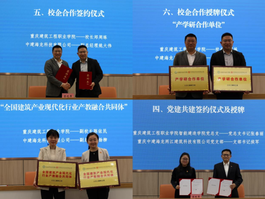 签约仪式上,校企双方代表共同签署了党建结对共建、产学研合作、中建海龙“定制班”、联合科研课题等协议,并授牌了“党建结对共建单位”“产学研合作单位”“智能建造与新型建筑工业化战略合作单位”“全国建筑产业现代化行业产教融合共同体”,为党建共建和校企合作奠定了基础。