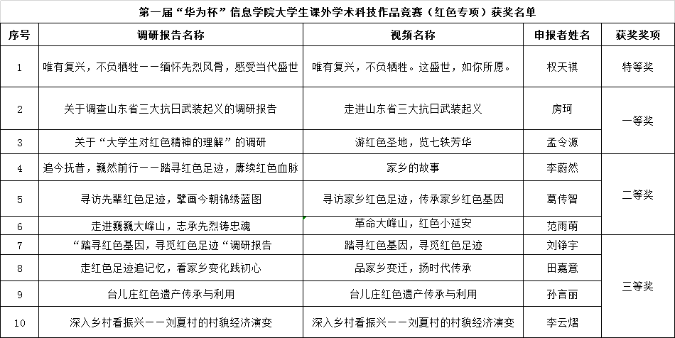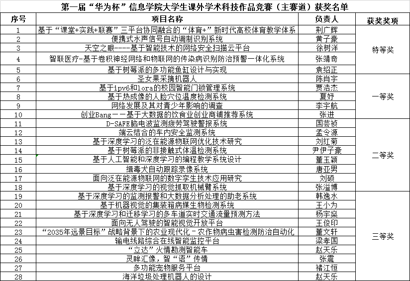 第一届“华为杯”信息学院大学生课外学术科技作品竞赛经学院初赛决赛于2021年3月9日圆满结束,主赛道共评出特等奖5项,一等奖5项,二等奖8项,三等奖10项;红色专项共评出特等奖1项,一等奖2项,二等奖3项,三等奖4项,现将获奖名单公示,详见附件。