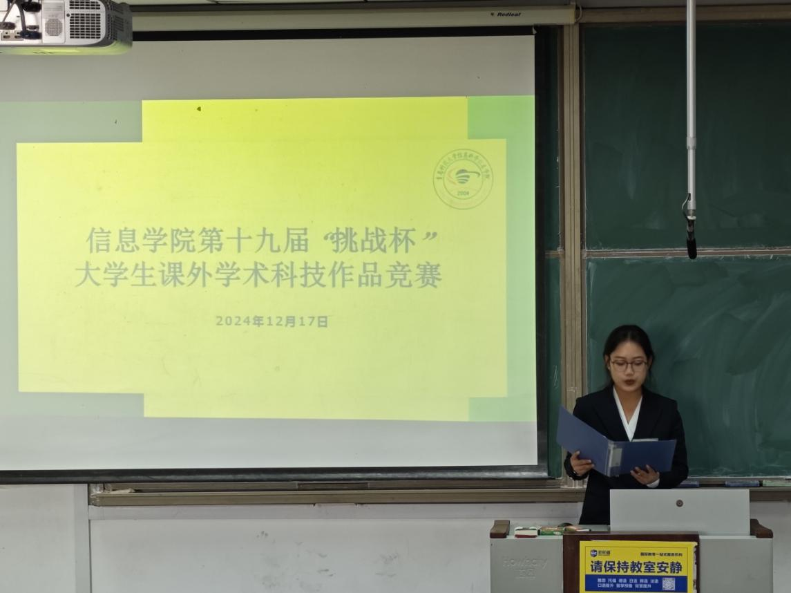 为深入为学习贯彻习近平新时代中国特色社会主义思想,贯彻落实党的二十大关于实施科教兴国战略,提高学生创新、创意、创造、创业的意识和能力,信息学院于 12 月 17 日下午在明德楼 238 教室举办第十九届“挑战杯”大学生课外学术科技作品竞赛决赛,双创学院刘夕升,信息学院专业教师刘明华、孙百才、江守寰、张俊虎以及往届挑战杯国赛队伍代表任大赛评委。