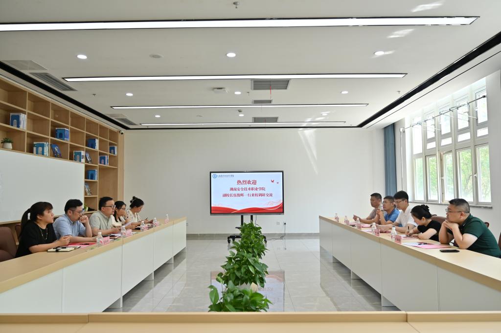 6月11日,湖南安全技术职业学院副校长伍俊晖一行来校调研交流。学校党委委员、副校长杨旗参加,智能建造学院、教务处、国际教育学院负责人等陪同调研。