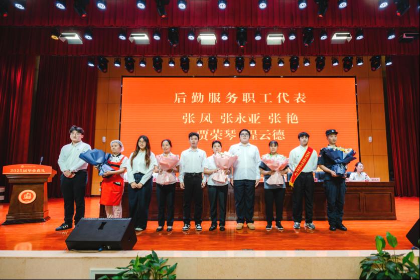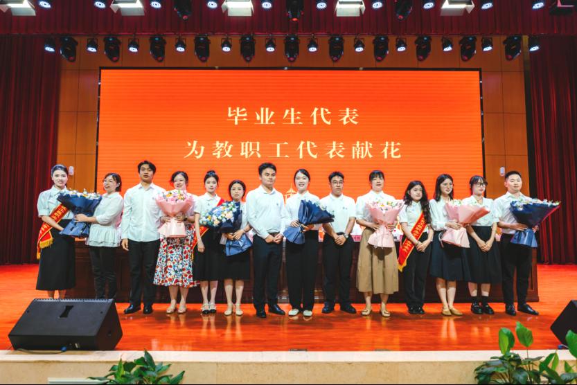毕业生代表向教职工代表和后勤服务员工代表献上鲜花,表达对三年来辛勤付出的师长和工作人员的诚挚谢意。