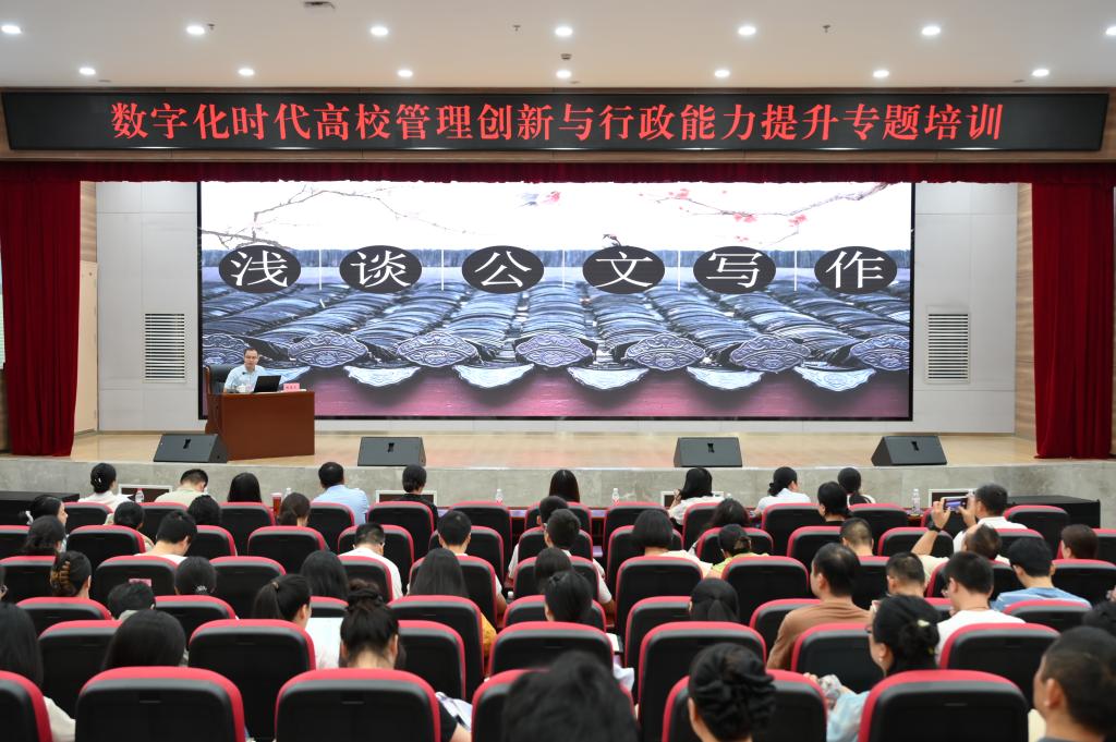为进一步提升干部文稿写作水平,增强履职能力,7月14日,koko体育邀请重庆市政府办公厅文秘处副处长陶俊杰、重庆电子科技职业大学人工智能与大数据学院云计算系教师杨睿到校作数字化时代高校管理创新与行政能力提升专题培训。党政办公室主任苟寒梅主持培训,全校约200名行政管理人员参加培训。
