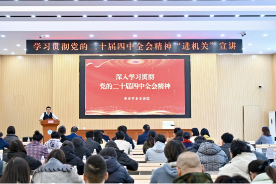 根据市直机关工委关于党的二十届四中全会精神宣讲工作统一安排,12月5日下午,学校在思政厅举行学习贯彻党的二十届四中全会精神“进机关”宣讲报告会。市委党史研究室副主任、机关党委书记周廷勇应邀作专题宣讲,学校党委副书记郭光亮主持会议。