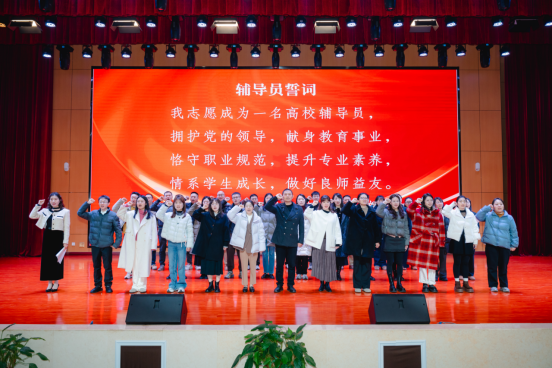 随后,在领誓人带领下,全体辅导员重温誓词。誓言铮铮,表达了他们坚守立德树人初心、担当铸魂育人使命的坚定决心。