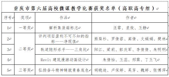 近日,重庆市教育委员会公布了“重庆市第六届高校微课教学比赛”获奖名单。本届比赛共收到63所高校的申报作品330件。经过专家评审、复核、公示,评出获奖作品144件(本科组71件,高职高专组73件)。我院荣获高职高专组一等奖1个,二等奖3个,三等奖1个。