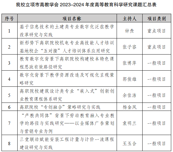 近日,重庆市高等教育学会发布了《关于2023—2024年高等教育科学研究课题立项的通知》(渝高学会发〔2023〕31号),koko体育申报的《基于信息技术的土建类专业数字化泛在教学改革研究与实践》等8项课题获批立项,其中重点项目2项,一般项目6项。8项课题涵盖了人才培养改革、教育数字化、创新创业教育、课程建设改革等多个领域。