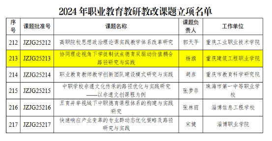 近日,教育部职业教育发展中心正式公布2024年职业教育教研教改课题立项名单,杨旗教授主持的课题《协同理论视角下学徒制试点德育双驱动价值耦合路径研究与实践》成功获批立项。